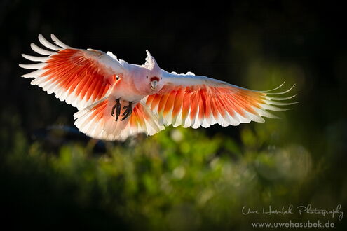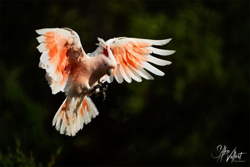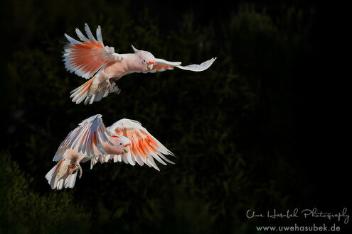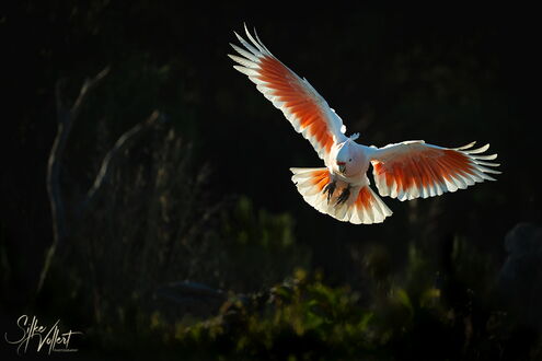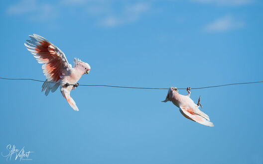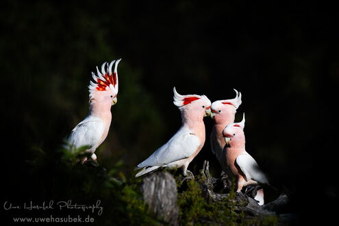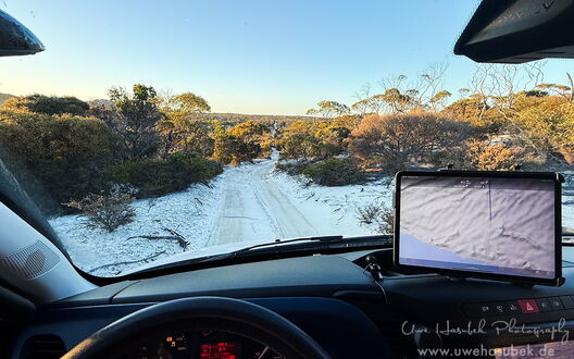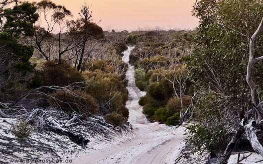 Unser Lichtblick ist die Eyre Bird Observatory Station. Hier soll es die Pink Cockatoos, früher Major Mitchel genannt, geben. Um dorthin zu kommen, muss man eine 12km lange Sandpiste fahren. Wir erkunden sie und beschließen den ersten Teil schon abends zu bewältigen, damit wir am nächsten Morgen vielleicht schon fotografieren können. Die Strecke ist vom Sand her für unseren Rockhopper leicht zu bewältigen, nur die Bäume und Büsche ragen an einigen Stellen zu sehr in die Piste rein, insbesondere in der Höhe. So muss Uwe an einigen Stellen das harte Holz teilweise sogar mit der Axt zurückschneiden. Nach der halben Strecke bleiben wir einfach auf dem Treck stehen und schlafen ein paar Stunden. Sehr früh am Morgen erledigen wir den Rest der Strecke und kommen pünktlich mit den Pink Kakadus an. Zwei von ihnen fliegen an und nehmen die Tränke in Anspruch, die so arrangiert ist, dass man sehr schöne Fotos machen kann. Wir sind überglücklich, dass wir diesen Tipp noch bekommen haben und genießen die nächsten drei Tage sehr. Die Vögel erscheinen in Abschnitten in immer anderen Formationen. An einem der Abende haben wir wunderschönes Licht und am letzten Morgen wollen uns offenbar alle unterhalten. Ungefähr 20 Tiere fliegen die Tränke an, machen Kunststücke an einem Draht oder hüpfen von einem Ast zum anderen. Wir sind total glücklich diese schönen Tiere in so vielen unterschiedlichen Lichtverhältnissen und Positionen fotografieren zu können.