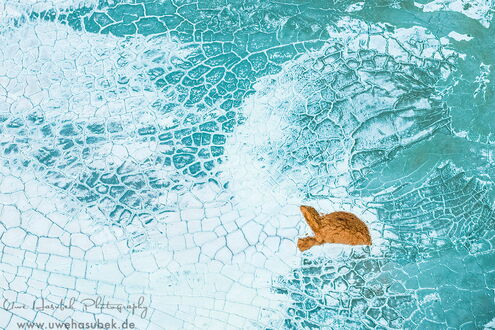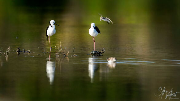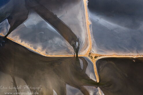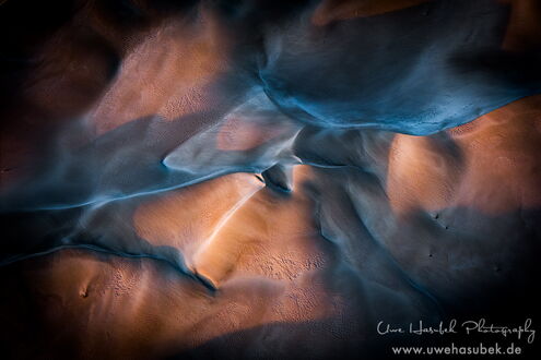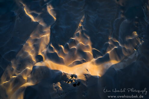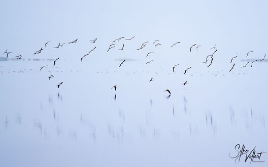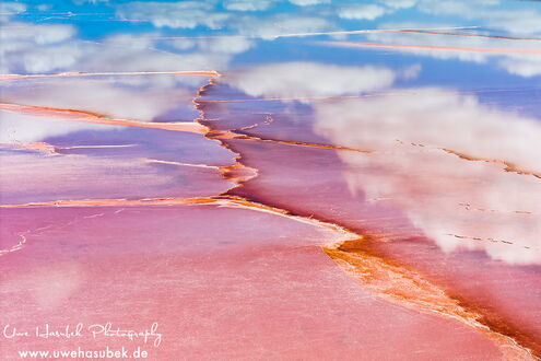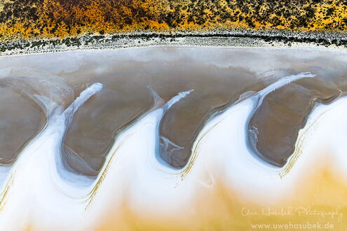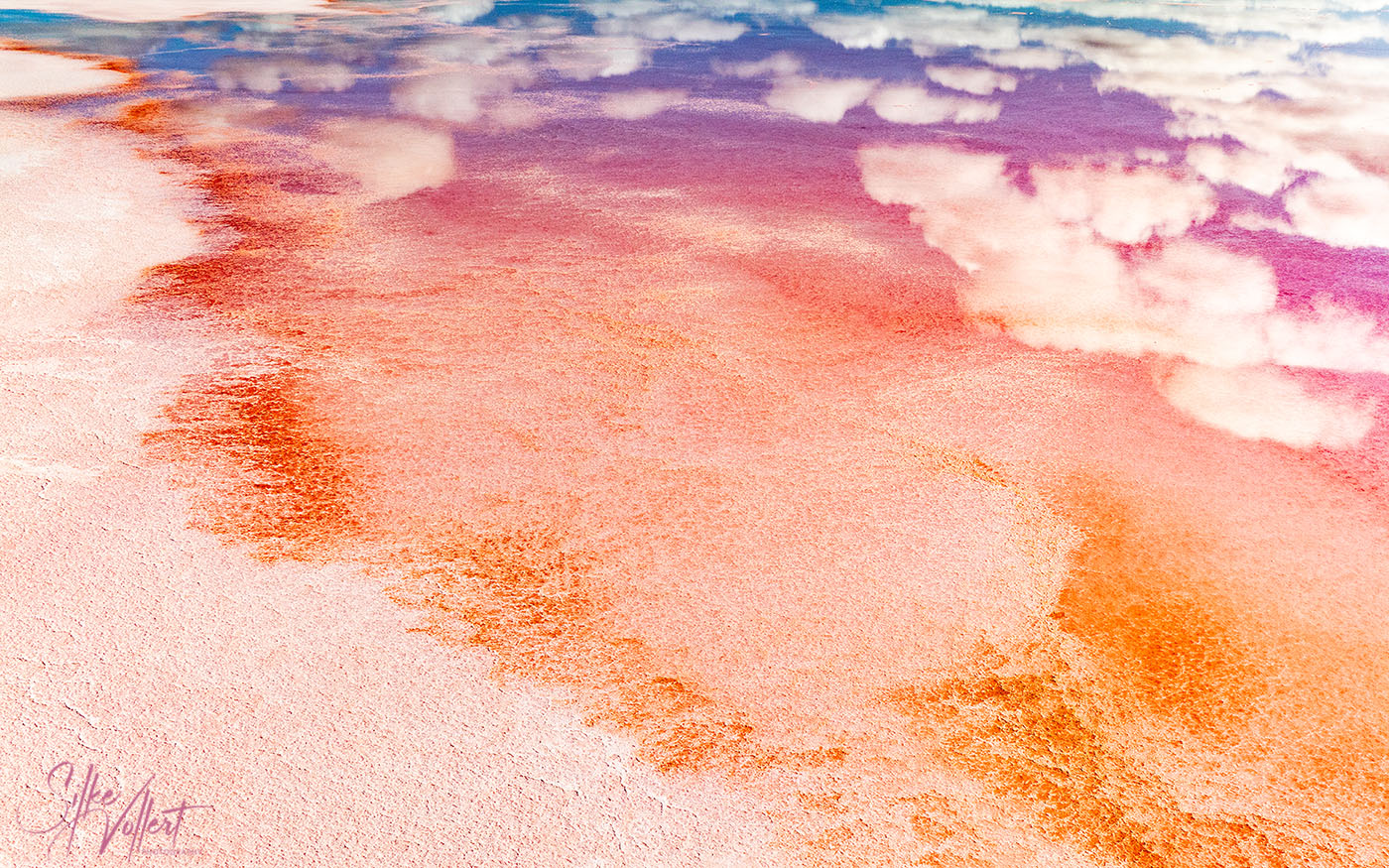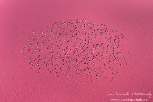 Zum Glück finden wir die Vögel anfangs sofort. Es ist aber schwieriger als gedacht, sie zu fotografieren. Sie sitzen in verschieden großen Gruppen teils am Ufer, teils auf dem See. Wenn sie auffliegen und ihre eindrucksvollen Kurven fliegen, sind sie zeitweise schneller als 70km/h, so dass es der Drohne nicht so leichtfällt, hinterher zu kommen. Wir lieben es ja, Vögel zu beobachten und ihre Verhaltensweisen zu studieren. So gelingt es Uwe mit ein wenig Übung im Laufe der zwei Tage, Aufnahmen zu bekommen, die Seltenheitswert haben. Nach unserem Wissen ist es sehr ungewöhnlich, dass sich die Vögel dort aufhalten. Darüber hinaus finden wir schöne Muster und Formationen, haben morgens sich spiegelnde Wolken auf dem See und sind wieder absolut begeistert von der Lagune.