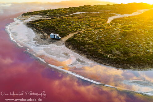 Bereits am ersten Morgen bekommt Uwe eine Nachricht von einem befreundeten Fotografen, der uns empfiehlt, zur Hutt Lagoon zu fahren. Dort soll es aufgrund der vielen Regenfälle Vogelschwärme geben. Als wären wir noch nie im Leben Auto gefahren, beschließen wir innerhalb von wenigen Minuten, dass wir die 300km one way fahren wollen. Hatten wir nicht genug vom Fahren???