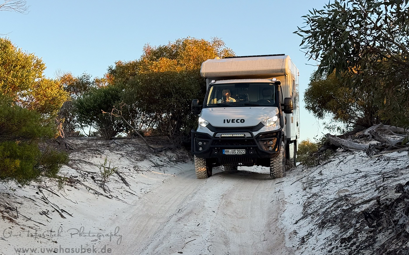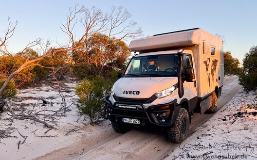 Am nächsten Tag beginnt dann der unendlich lange Weg nach Perth. Einmal über den Kontinent von Ost nach West. Das Auto fährt mit den neuen Highend-Stoßdämpfern hervorragend. Nun geht leider die Wasserpumpe in der Kabine kaputt. Wieder etwas zu regeln. Zum Glück gibt es passgenaue Ersatzteile in Australien, die wir jetzt nach Perth bestellen.