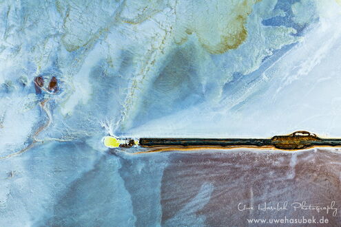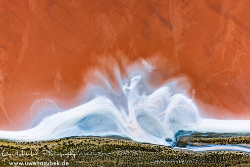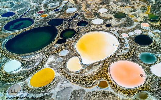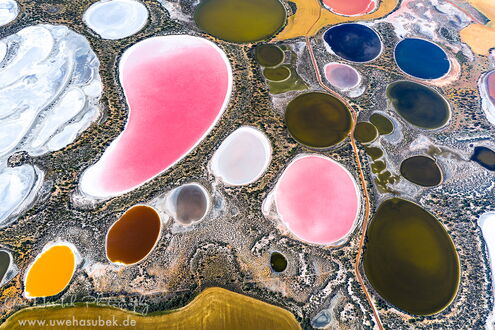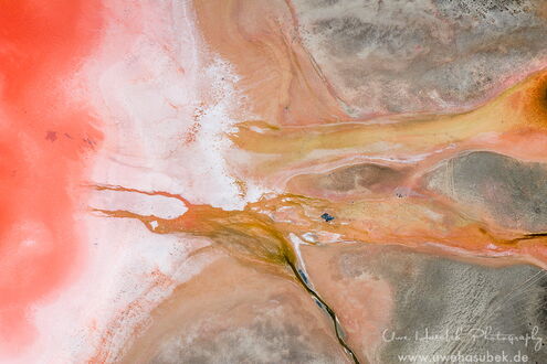 Anschließend beginnen wir unsere Tour auf der Suche nach beeindruckenden Salz- und Schlammteichen (Tailing ponds). Letztere liegen in der Regel in der Nähe von Erzminen, die dort feinkörnige Rückstände aus der Aufbereitung von Erzen zumeist in Form von Schlämmen ablagern. Sie sind oft sehr intensiv farbig und sehen aus der Luft sehr eindrucksvoll aus. Dies ist unsere dritte Tour dieser Art. Gerade die Salzseen sehen jedes Mal anders aus, da ihre Färbung von vielen Faktoren abhängt und niemand voraussehen kann, wie sie sich ändern. Wenn sie vollständig ausgetrocknet sind, sind sie meist langweilig weiß, beige oder grau. Wenn sie jedoch die richtige Mischung aus Wasser, Algen und Mineralien aufweisen, können sie wunderschöne, abstrakte Strukturen aufweisen, die auf Fotos sehr beeindruckend wirken.